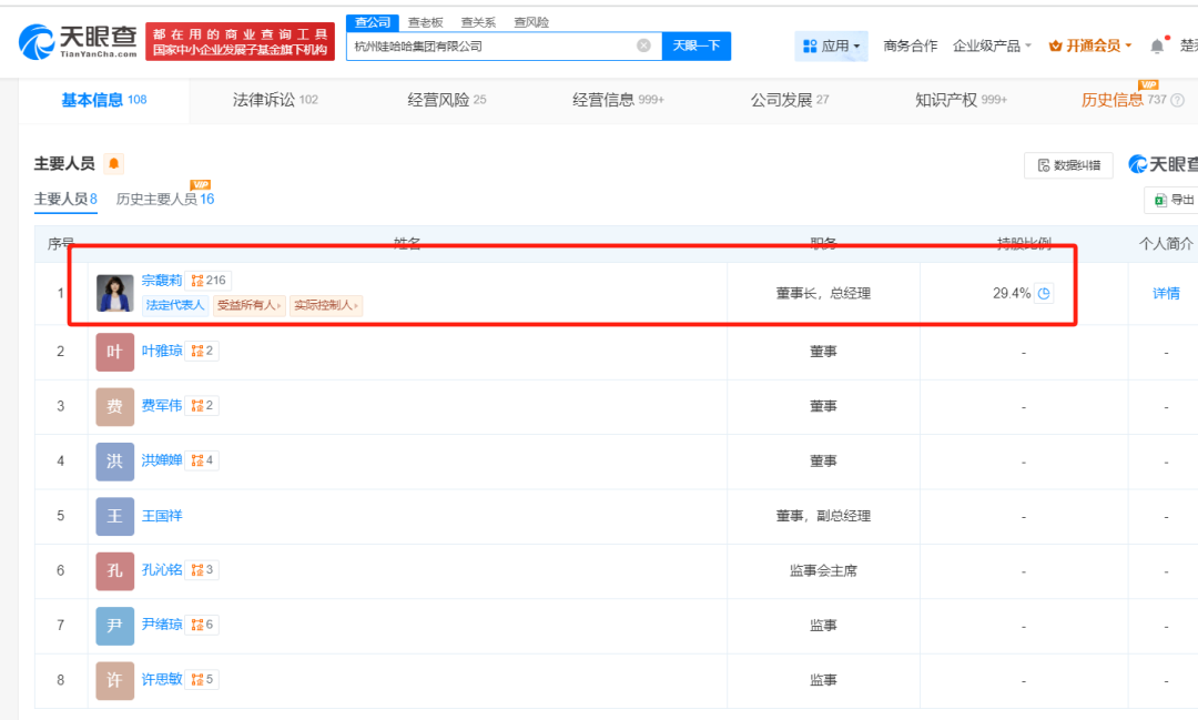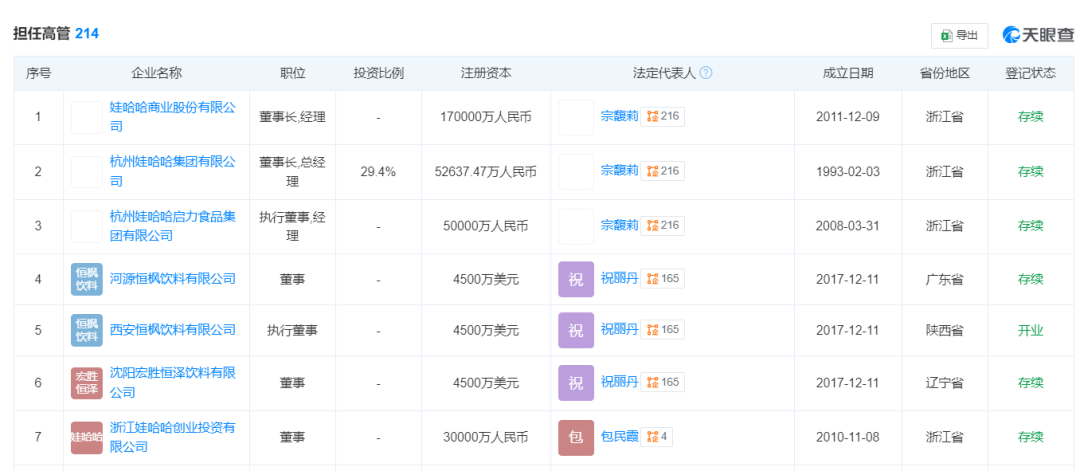 金石杂谈查询天眼查发现,宗馥莉担任高管的企业214家,任职企业216家,担任法人40家。在天眼查,宗馥莉不仅是宏胜饮料集团总裁、她还是杭州娃哈哈集团公司董事长兼总经理。