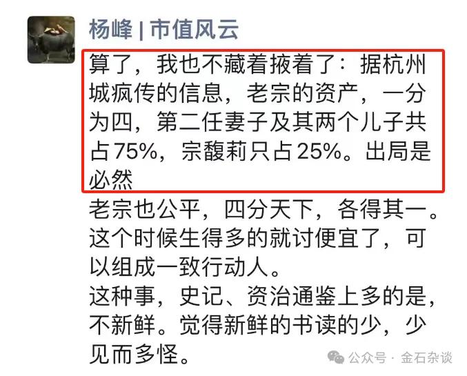 其实,关于宗庆后不止宗馥莉一个孩子的传闻由来已久,除了去年宗庆后去世之初,还有就是知名自媒体平台市值风云董事长杨峰的爆料:他说也不藏着掖着了:据杭州城疯传的消息,老宗的资产,一分为四,第二任妻子及其两个儿子共占75%,宗馥莉只有25%。